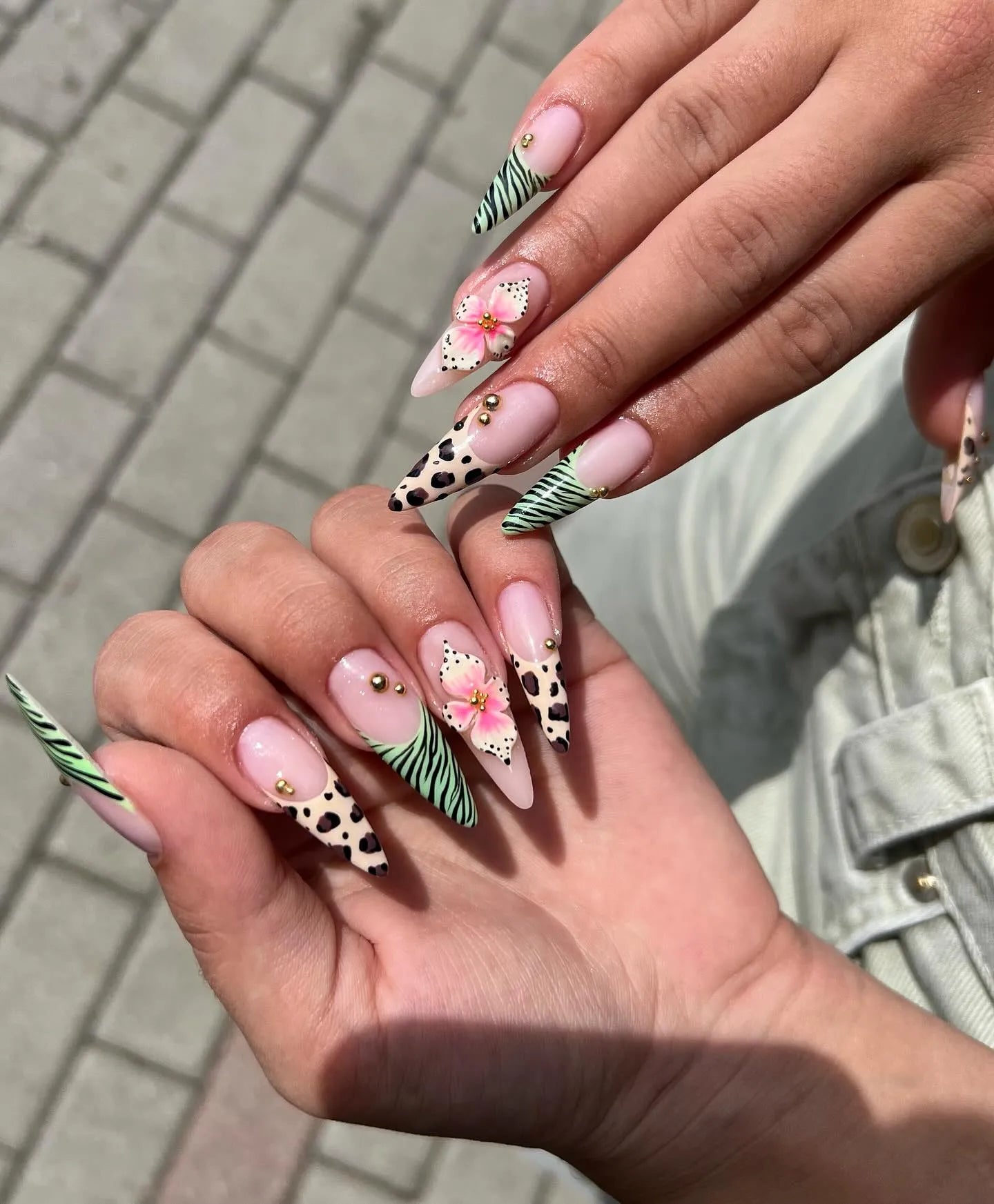 Step into the wild with this artistic Handmade press-on nail set! Featuring trendy leopard spots, vibrant green zebra stripes, and delicate 3D pink flowers on a nude base, these customizable designs are reusable and boast a bold glossy finish. Perfect for any event or daily wear, especially festivals, vacations, or unique summer fashion. Available in many shapes and lengths—like Short, Medium, or Long, and shapes like Almond, Coffin, or Stiletto—these fashion-forward fingernails offer unmatched, high-impact style. Shop this extraordinary set now!