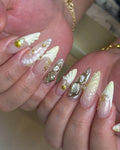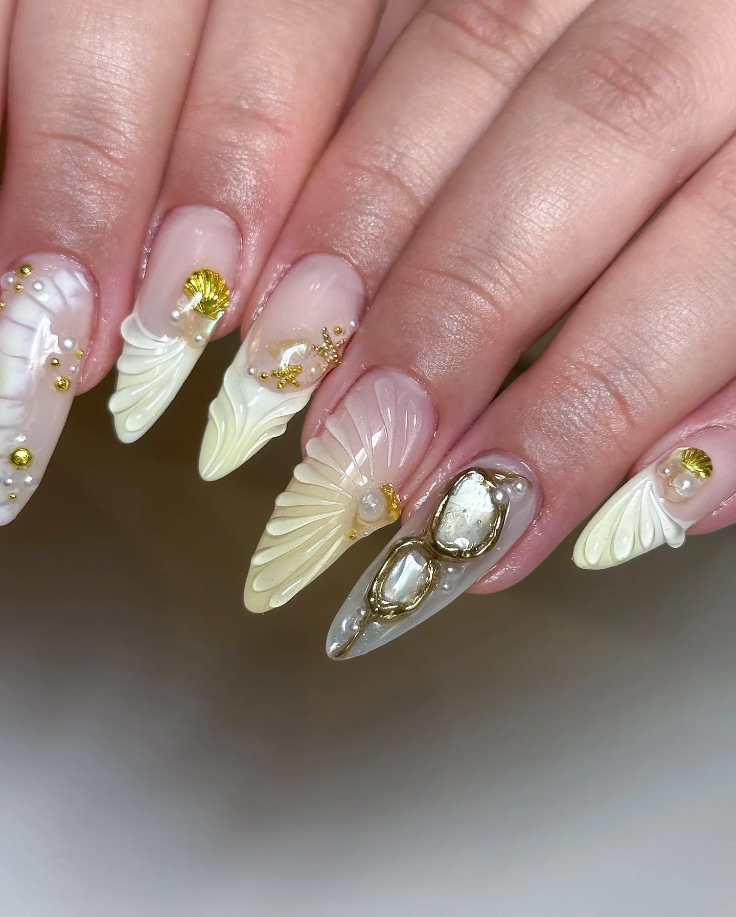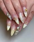 Discover the magic of handmade press on nails perfect for your next getaway! These reusable fingernails feature customizable designs with delicate 3D shells, pearls, and gold accents. They are ideal for a beach wedding, summer vacation, or any event or daily wear, offering a radiant finish. Available in many shapes and lengths—like Medium or Long—you'll adore this unique ocean-inspired set. Buy yours now!