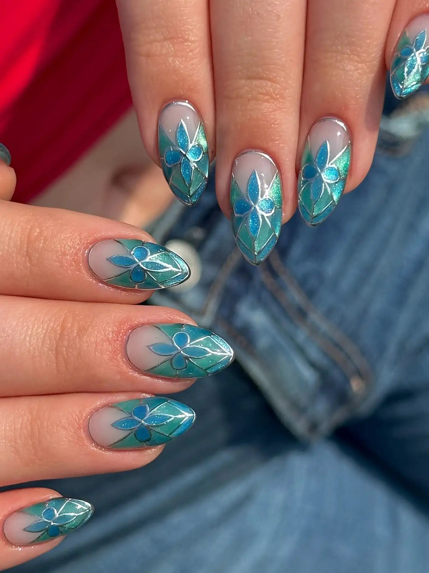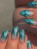 Adorn your fingernails with these artistic handmade press-on nails! They feature unique stained glass flower designs with sleek silver lines in gorgeous blue and teal hues. Reusable and customizable, these elegant nails are perfect for special events or daily wear. Available in various shapes and lengths. Get your stunning set now!