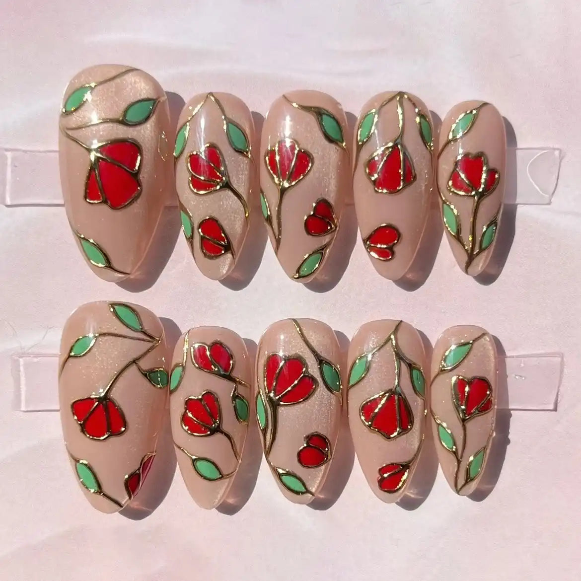 Adorn your fingernails with these exquisite Handmade artistic press-on nails! This reusable set features a stunning stained glass effect with vibrant red rose petals and leaves outlined in rich gold. Get customizable designs and choose from many shapes and lengths (like Almond, Oval, Medium, Coffin, or Long). These elegant nails are perfect for any event or daily wear—especially date nights, sophisticated dinners, Valentine's Day, or adding a touch of class. Treat yourself to this uniquely beautiful set today!