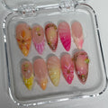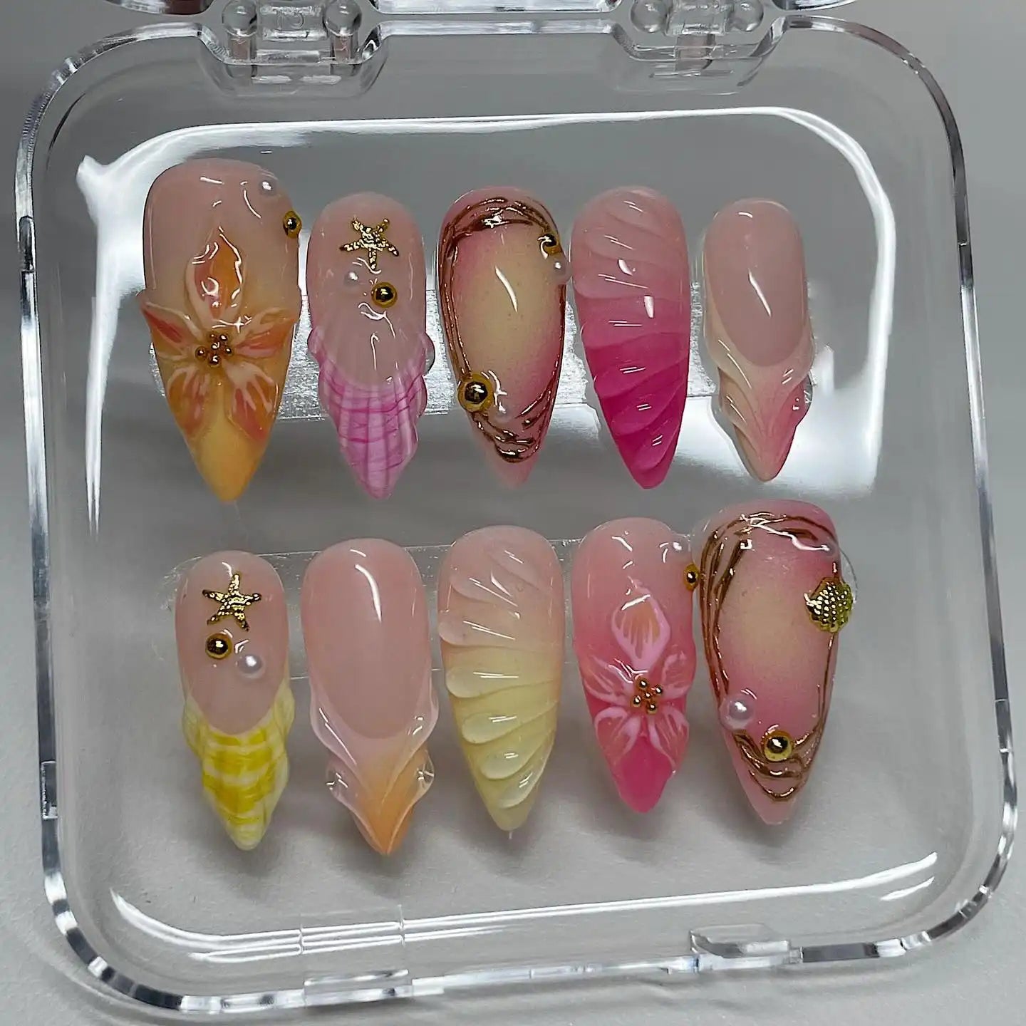 Handmade Sunset Ombre Pink Orange Floral Shell Gold Accent Press on Nails Y82