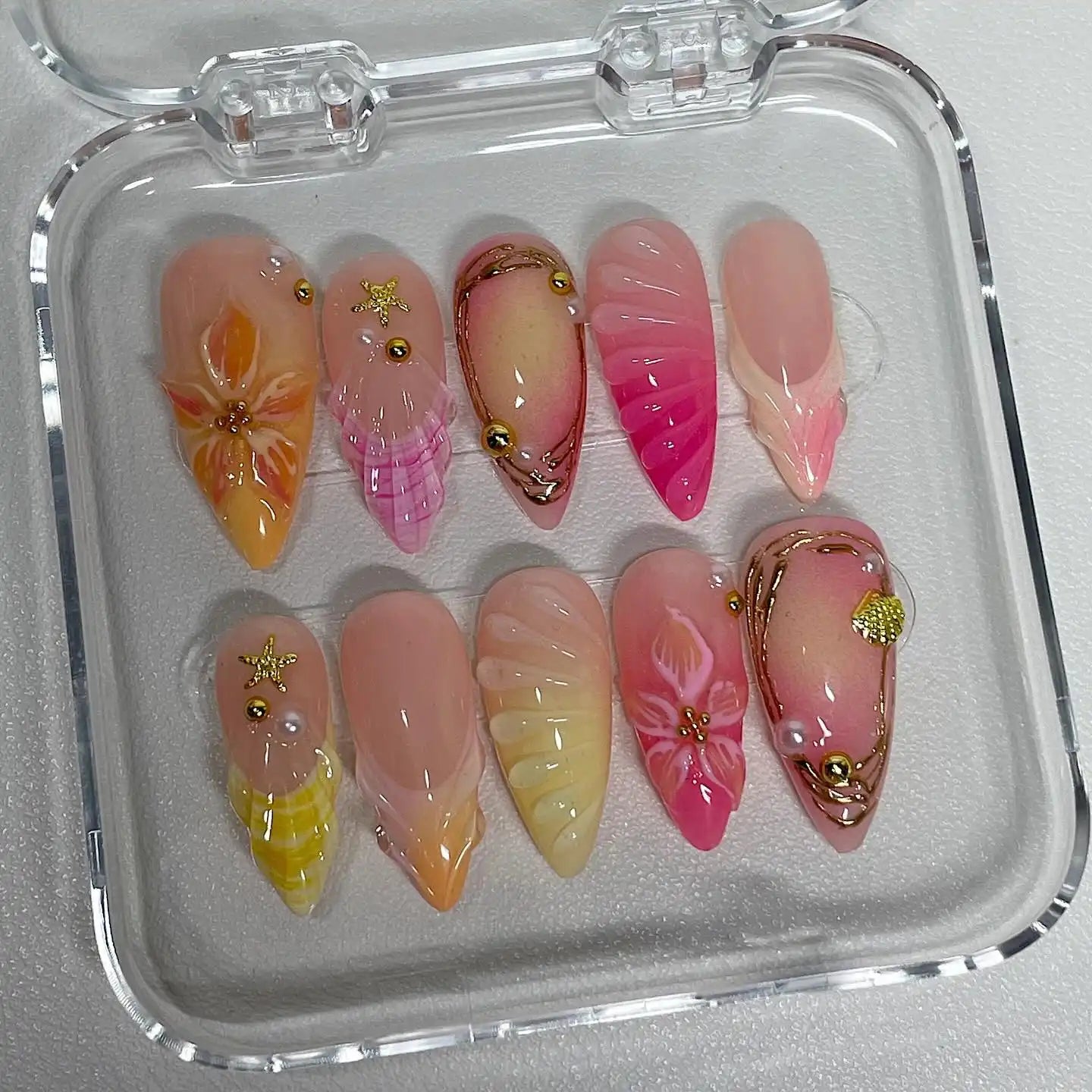 Glow with the warmth of a sunset in these vibrant handmade press-on nails! They showcase a beautiful pink/orange ombre, delicate 3D flowers, and gold shell accents for a stunning glossy finish. These cheerful fingernails are perfect for bridal showers, summer festivals, or any event or daily wear. Offered in customizable designs and shapes like Almond, Oval, or Square. Illuminate your everyday look with this breathtaking design!