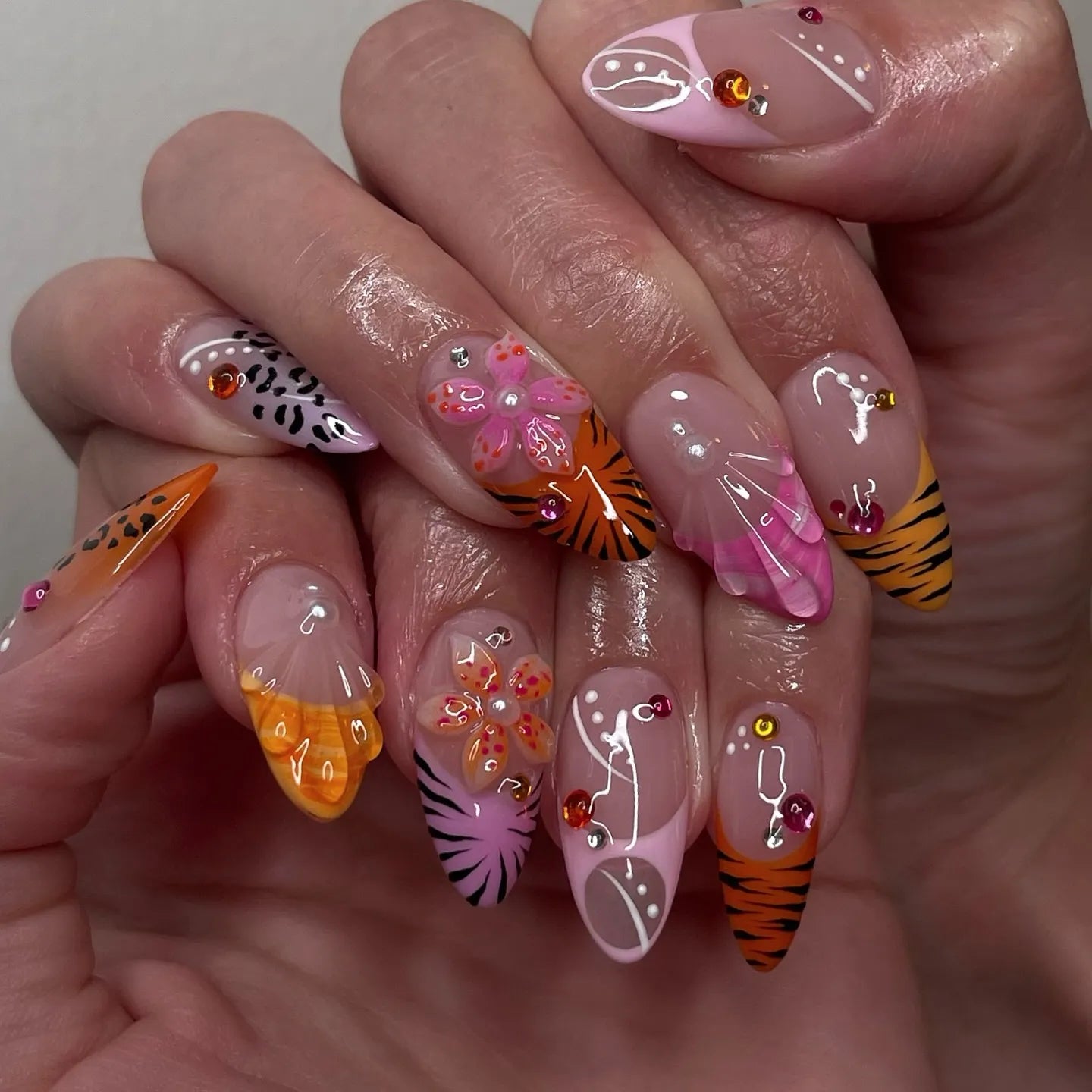 Handmade Tiger Pink Orange Flower Print Fun Abstract Safari Press on Nails T97