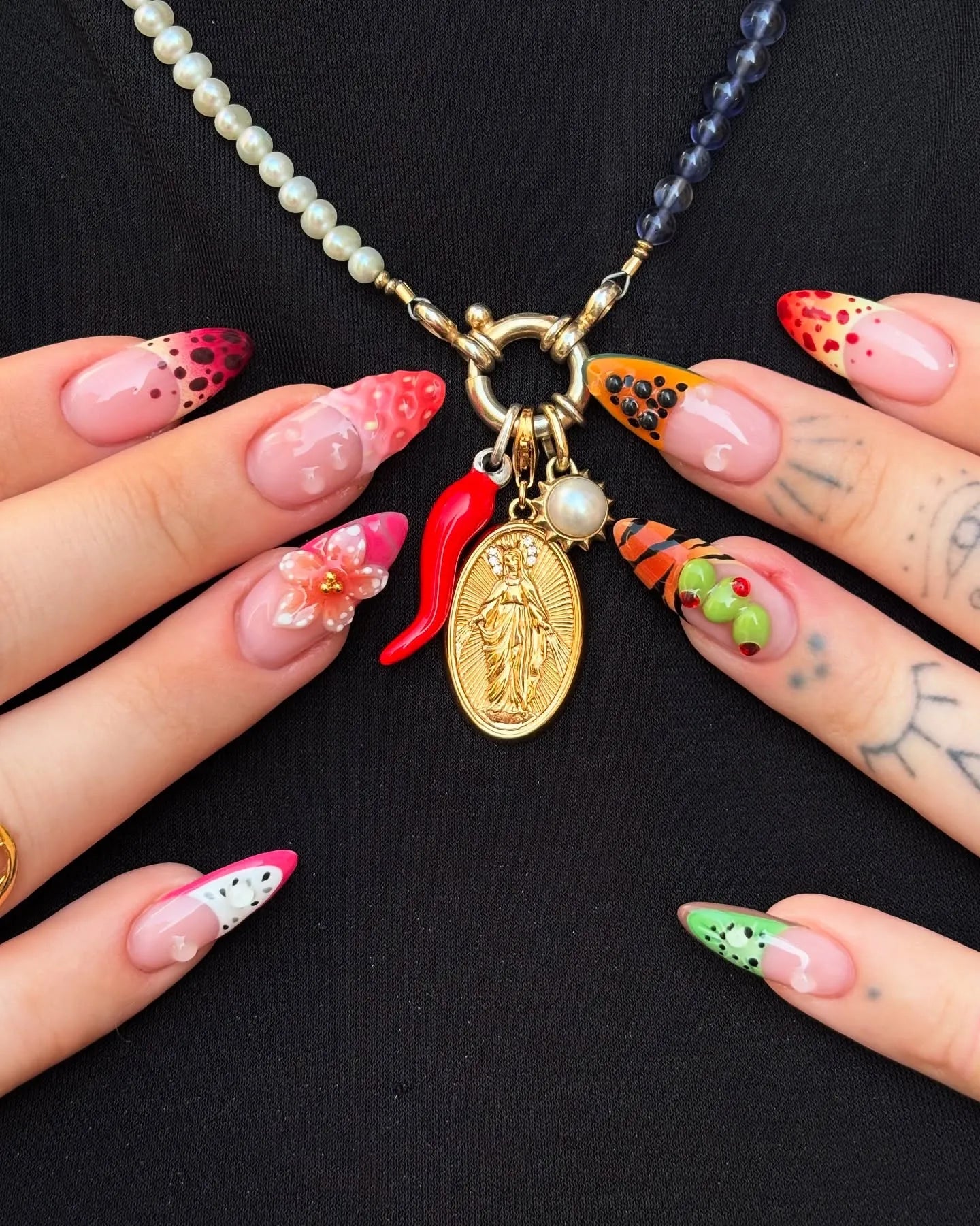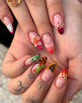 Embrace summer vibes with these playful handmade press-on nails, featuring a vibrant mix of tropical fruit art, a 3D flower, and fun animal prints. These reusable fingernails have a glossy finish, perfect for vacations, parties, or brightening any day. Available in customizable designs like Short, Medium, or Long lengths and shapes including Almond, Coffin, or Square. Get ready for summer fun and order this colorful, unique nail set today!