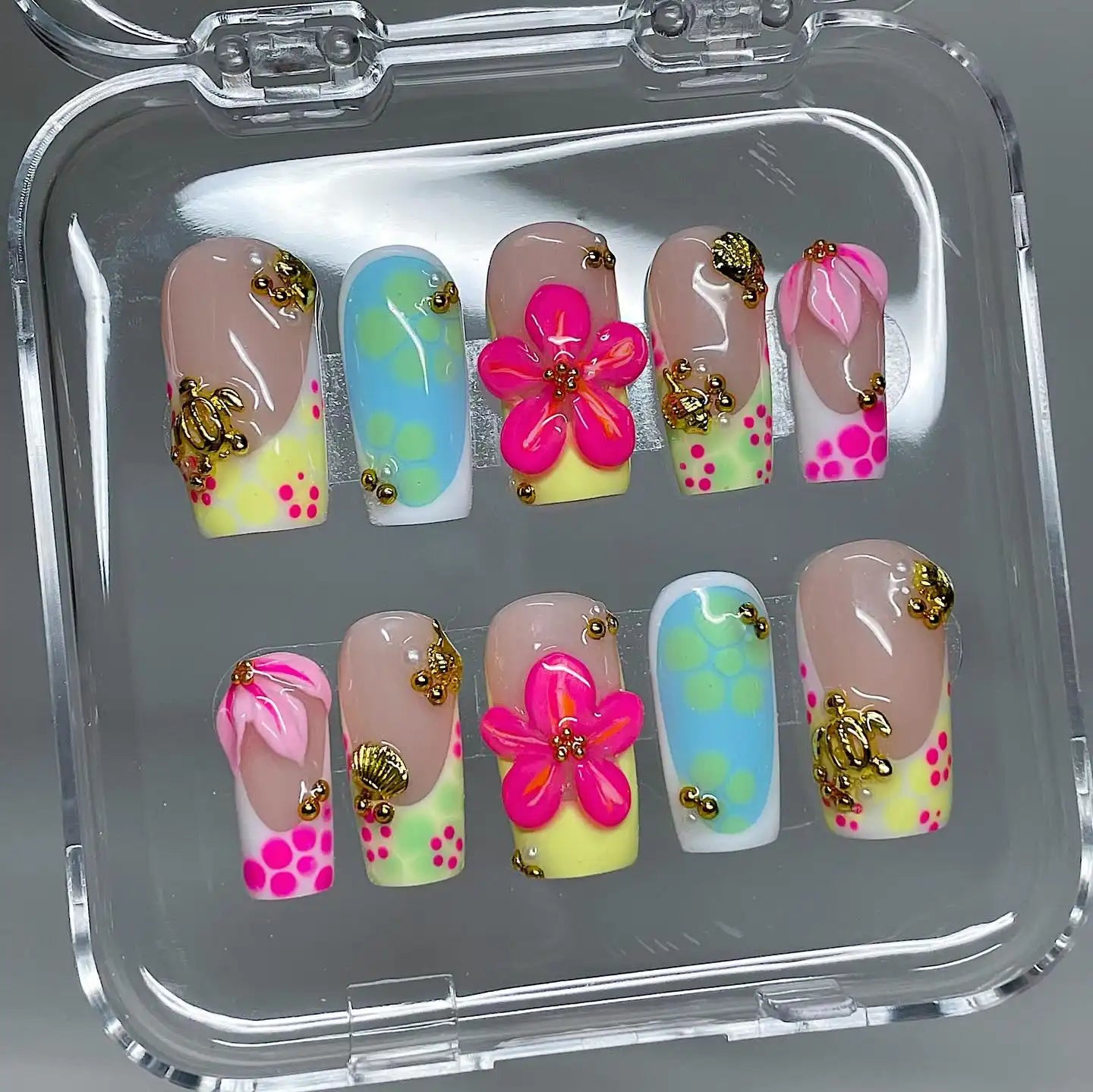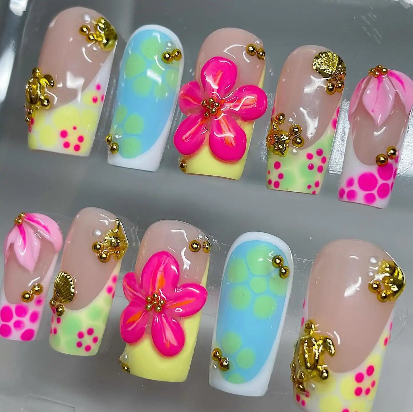 Handmade Tropical Neon Flower Turtle Polka Dot Gold Press on Nails Y40