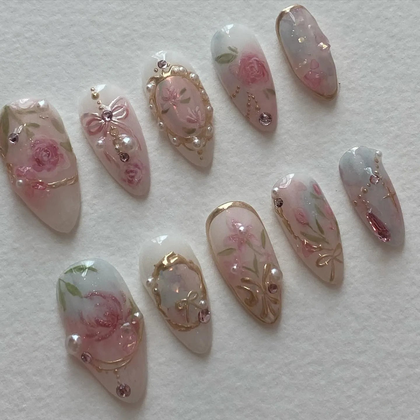 Handmade Vintage Pink Rose Gold Frame Romantic Press on Nails F29