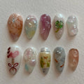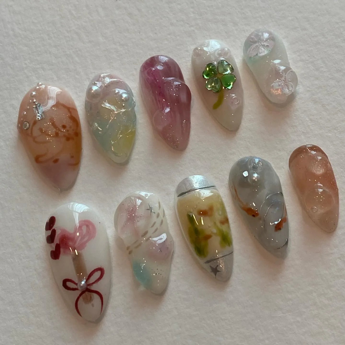 Handmade Whimsical Koi Fish Clover Heart Pastel Watercolor Fantasy Press on Nails P87