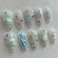 Wear a whimsical dream with these enchanting Handmade reusable press-on nails. Featuring customizable designs and available in lengths and shapes like Short, Long, or Almond, these are perfect for a photo shoot, dance recital, or any event or daily wear. The soft pastel background, cute star details, and shimmering music notes create a lighthearted, fantasy look on your fingernails. Express your inner magic! Secure this extraordinary, unique set for a playful style!