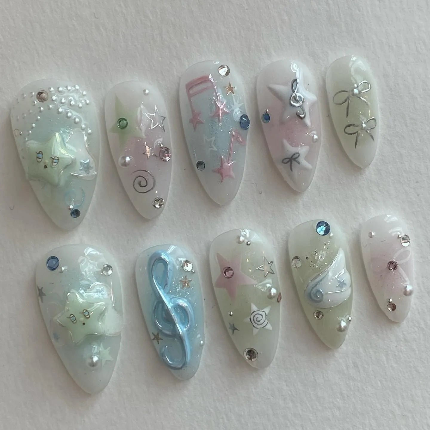 Handmade Whimsical Star Music Note Bow Pearl Pastel Aesthetic Press on Nails Z07