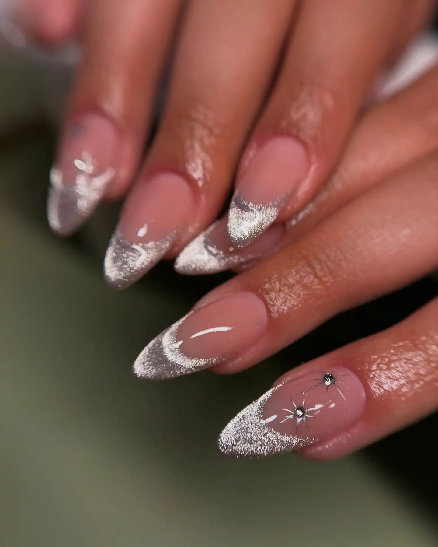 These handmade press-on nails feature a stunning white cat-eye design paired with silver glitter French tips. The soft nude base enhances the elegant and modern look, while the cat-eye effect adds a mesmerizing touch. Perfect for any occasion, these nails offer a sophisticated, yet edgy style with a shimmering finish. Reusable and customizable, they provide lasting beauty. Get your set today and enjoy the perfect blend of elegance and mystique!