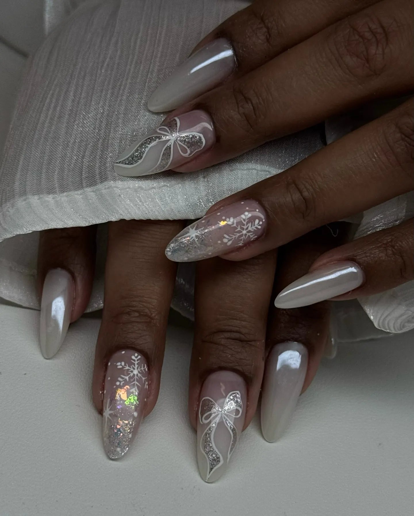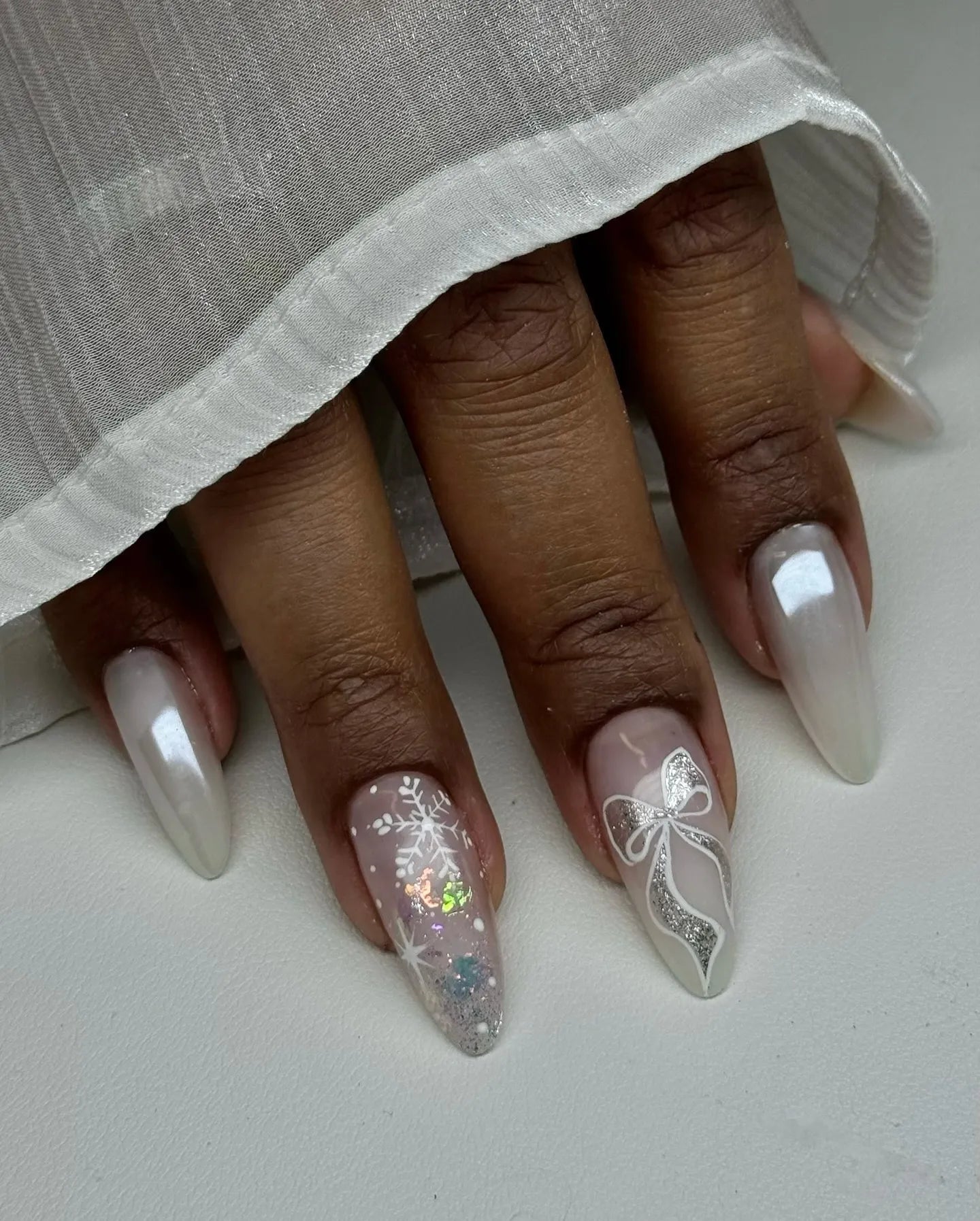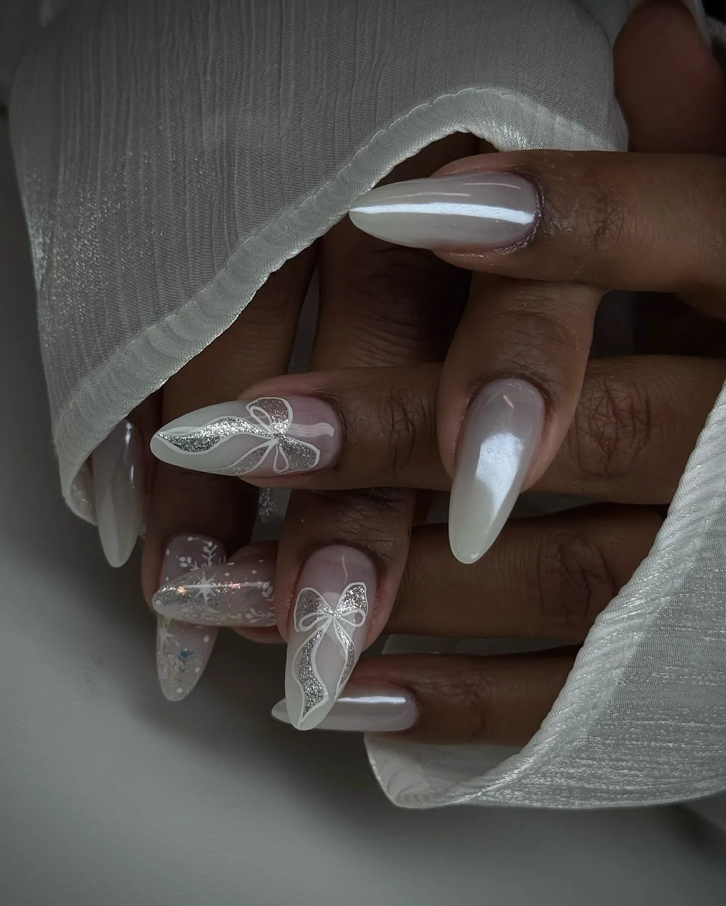Handmade White Silver Pearl Snowflake Bow Winter Press on Nails U76