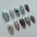 Channel an icy elegance with these breathtaking Handmade reusable press-on nails. Featuring customizable designs and available in lengths and shapes like Stiletto, Coffin, or Almond, these are perfect for a winter formal, holiday party, or any event or daily wear. The cool gray, shimmering chrome, and sparkling crystal clusters create a beautiful, frosted aesthetic on your fingernails. Captivate with a touch of winter magic! Secure this luxurious, high-fashion set for your next event!