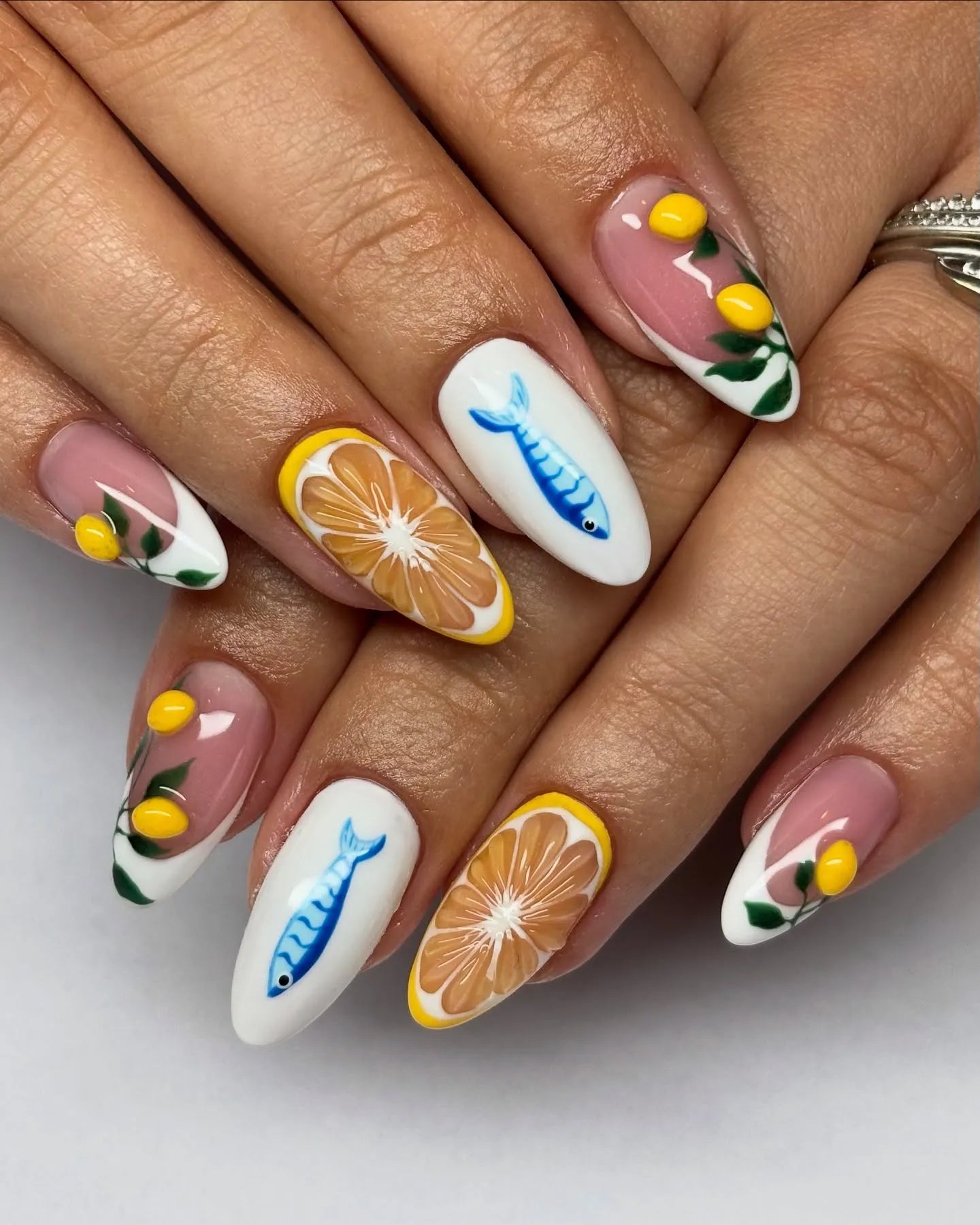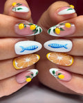 Handmade Yellow Lemon Blue Fish Mediterranean White Press on Nails A43