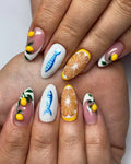 Transport yourself to the Italian coast with these vibrant handmade press-on nails featuring hand-painted lemons and blue fish. These reusable fingernails offer a high-quality glossy finish, making them perfect for summer vacations or daily wear. Our customizable designs come in many shapes and lengths, including Almond, Coffin, or Square. Bring a refreshing citrus vibe to your look today.