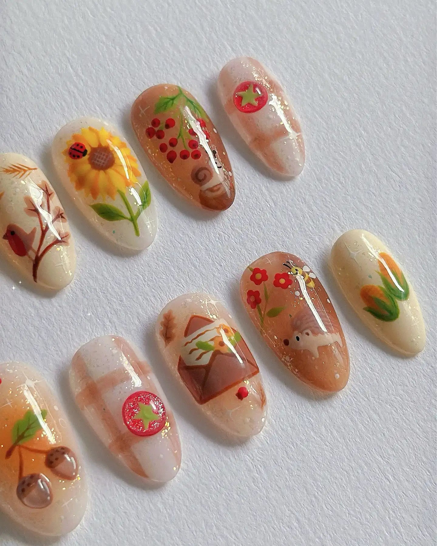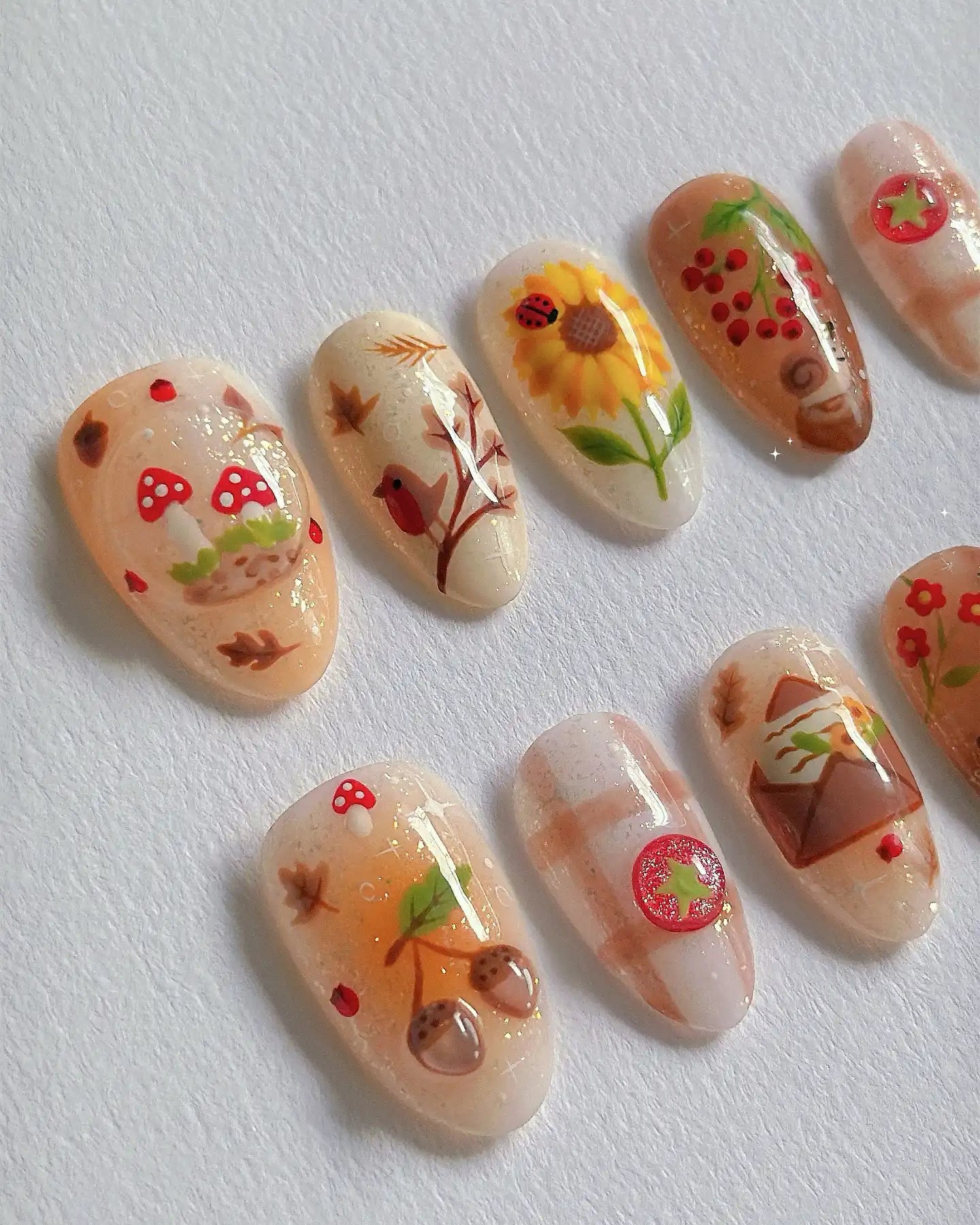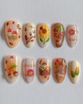 Handpainted Cute Autumn Mushroom Sunflower Berry Press on Nails K83