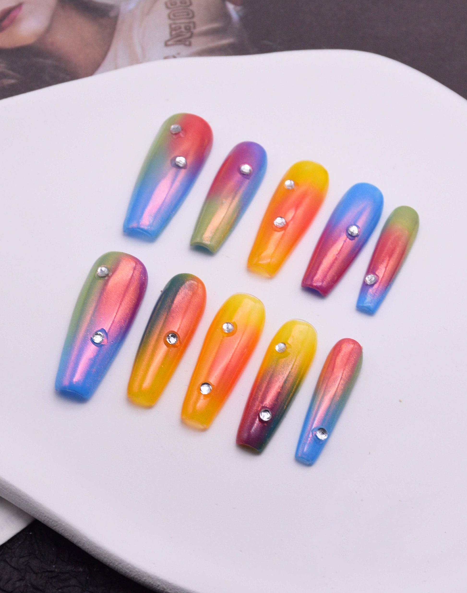 Introducing our Vibrant Ombre Summer Handmade Press on Nails! Featuring a stunning Rainbow Aurora design, these eye-catching false nails are perfect for adding a stylish touch to your summer ensemble.