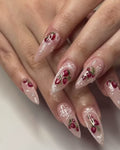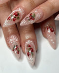 These elegant handmade press-on nails feature delicate cherry fruit art with fine white lace detailing on a soft blush base. The romantic and vintage-inspired design adds a sweet and feminine charm, perfect for garden parties, tea dates, or everyday elegance. Customizable in shape and size to ensure a perfect fit, this reusable set is ideal for those who love hand-painted, dainty details. Add a touch of timeless beauty to your fingertips—order your cherry lace nails today!