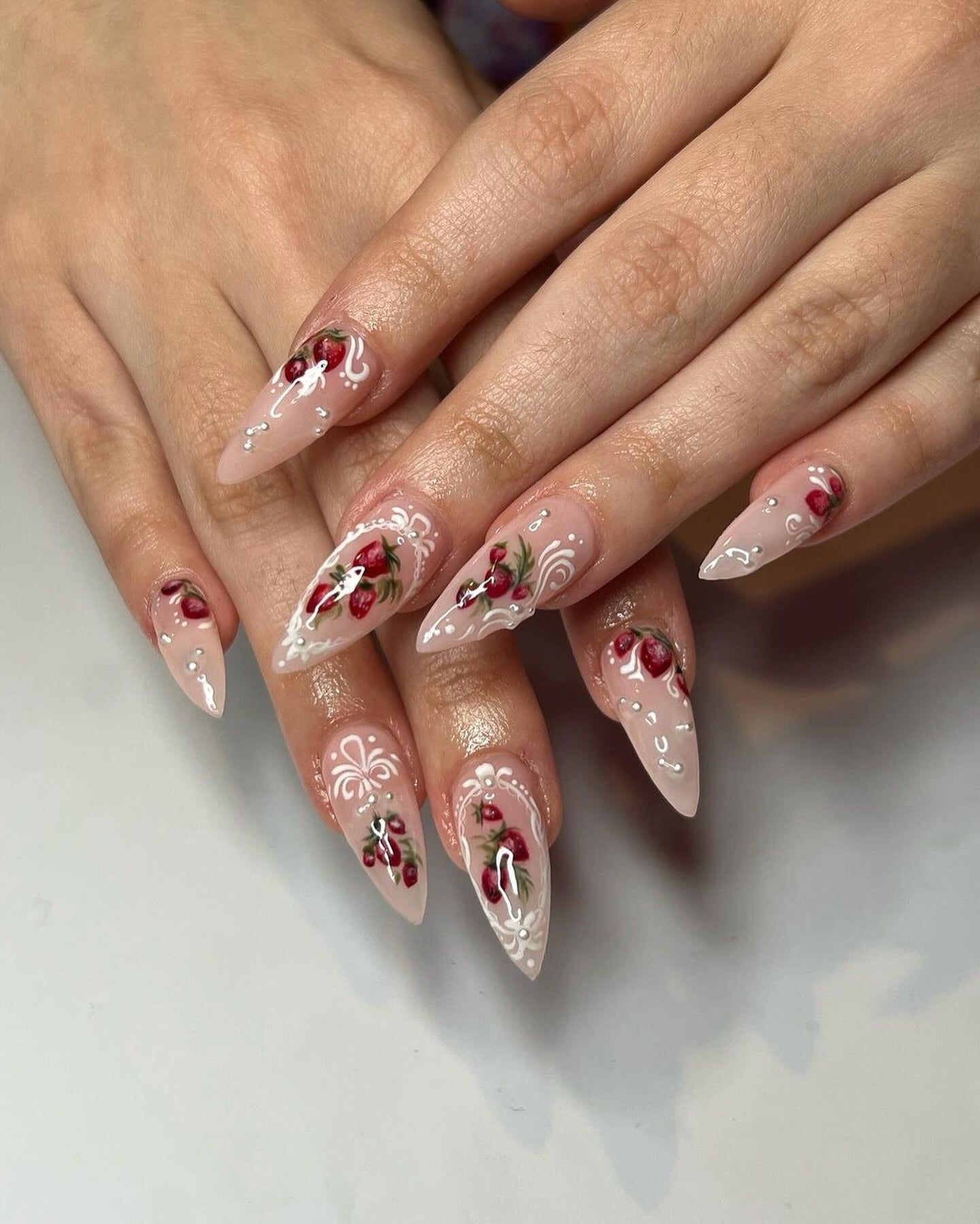 Vintage Cherry Lace Nails – Hand-Painted Red Fruit Press-On Set S64